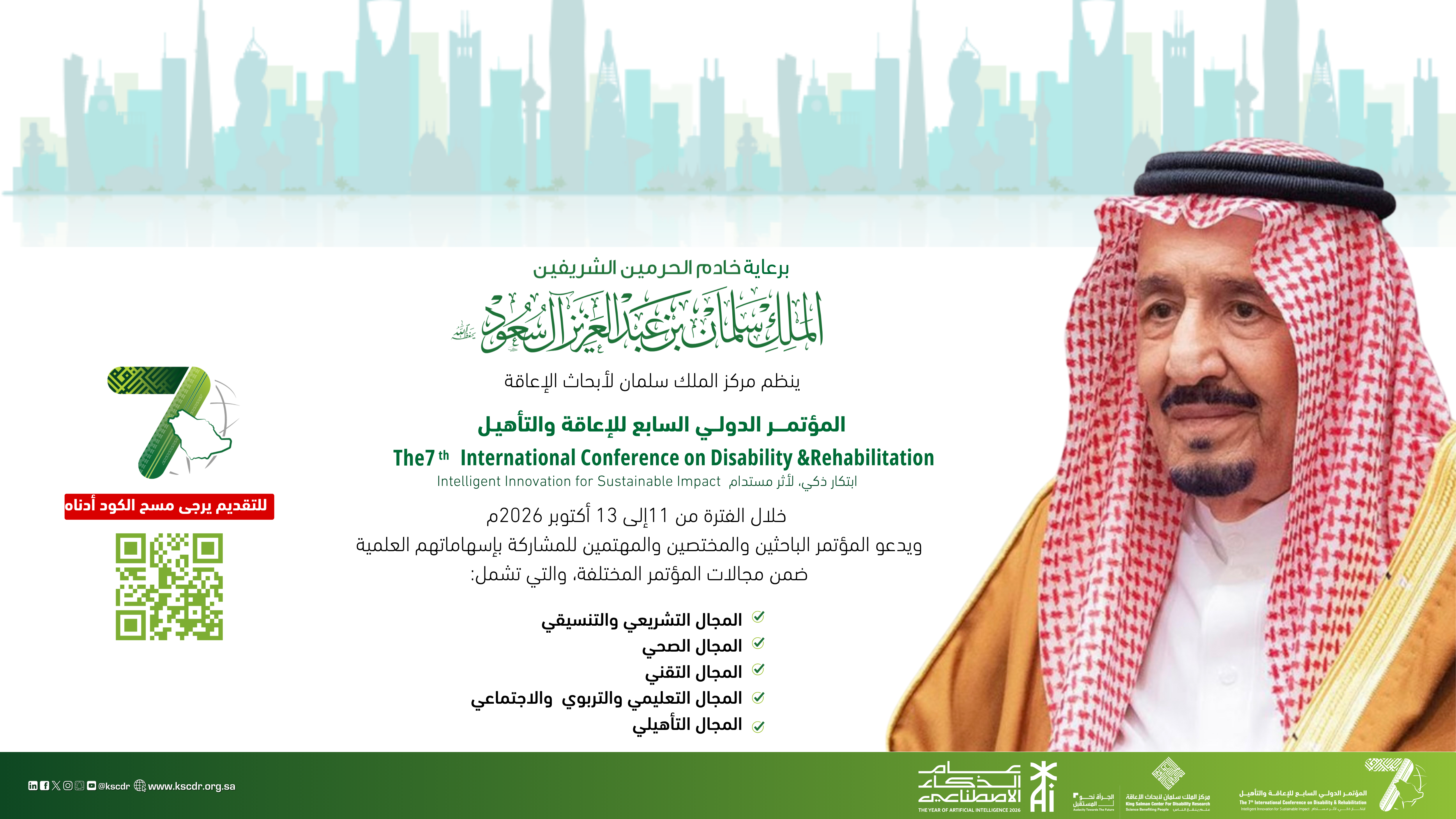 برعاية خادم الحرمين الشريفين الملك سلمان بن عبدالعزيز آل سعود – حفظه الله –، ينظم مركز الملك سلمان لأبحاث الإعاقة المؤتمر الدولي السابع للإعاقة والتأهيل، تحت شعار “ابتكار ذكي لأثر مستدام”.