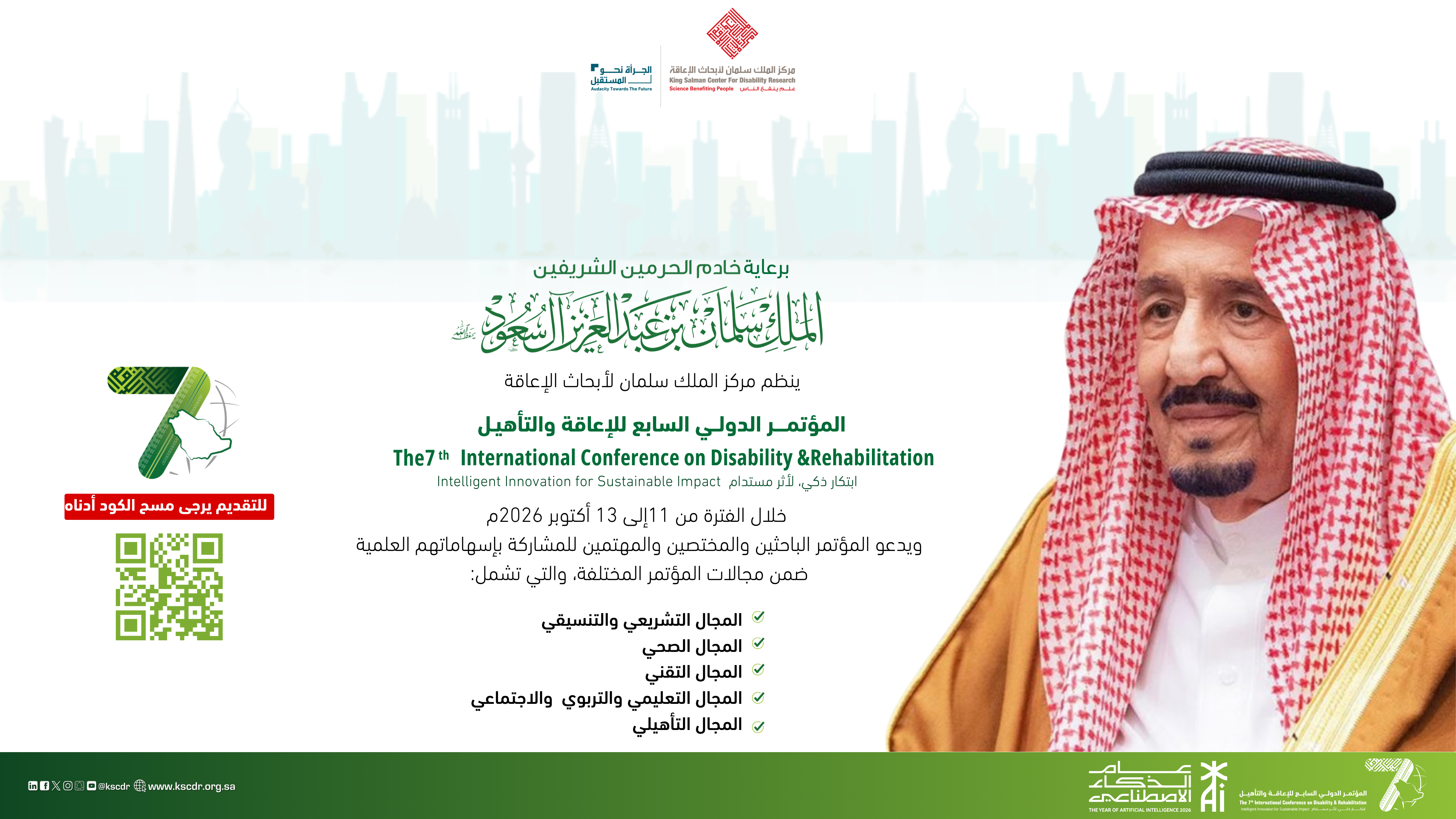 برعاية خادم الحرمين الشريفين الملك سلمان بن عبدالعزيز آل سعود – حفظه الله –، ينظم مركز الملك سلمان لأبحاث الإعاقة المؤتمر الدولي السابع للإعاقة والتأهيل، تحت شعار “ابتكار ذكي لأثر مستدام”.