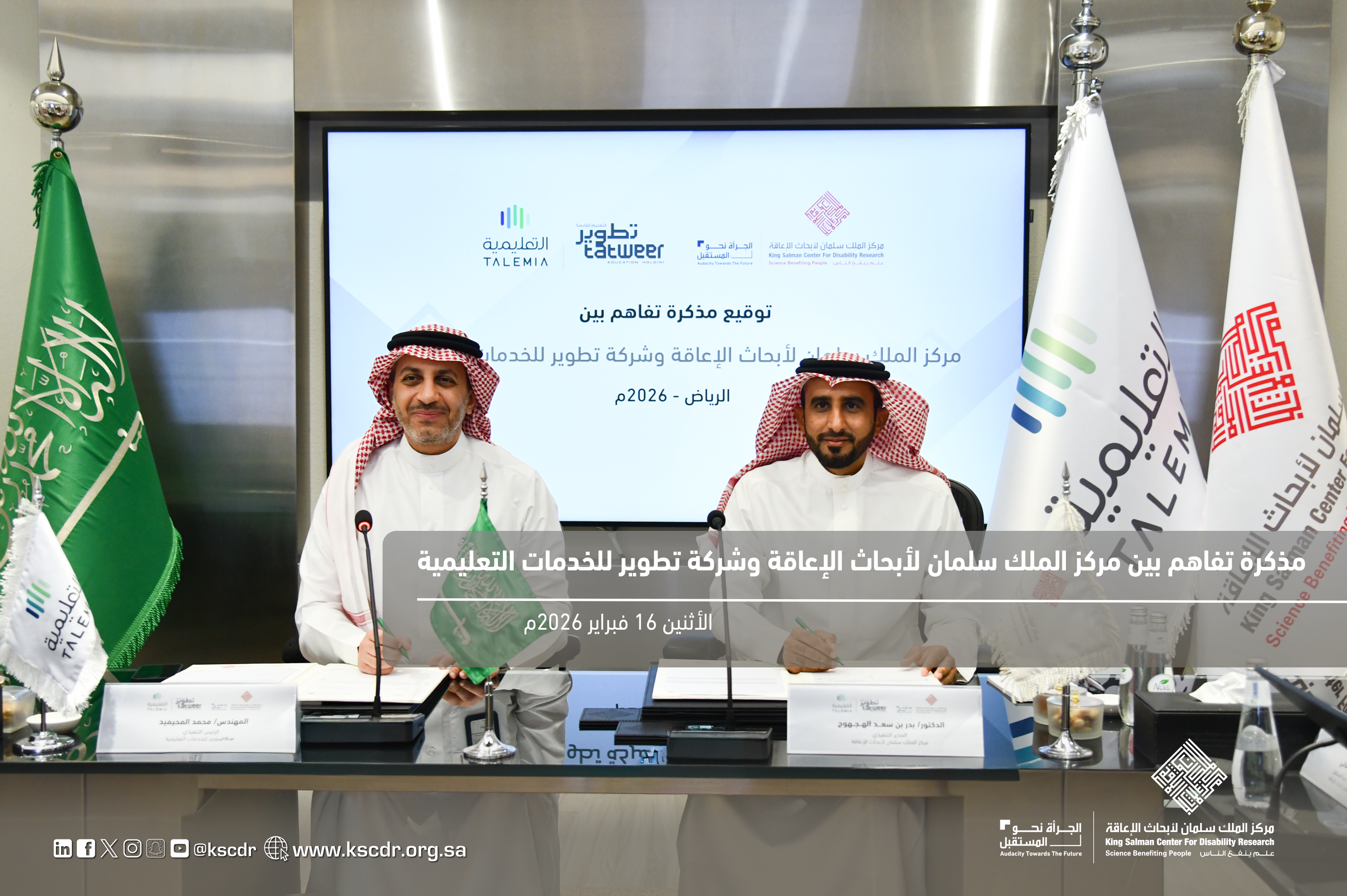 في إطار دعم مجالات التعاون وتطوير المبادرات العلمية والتعليمية، جرى توقيع اتفاقية تعاون بين مركز الملك سلمان لأبحاث الإعاقة وشركة تطوير للخدمات التعليمية، وذلك انطلاقًا من توجه الطرفين نحو تعزيز التكامل المؤسسي وتوسيع نطاق العمل المشترك بما يسهم في خدمة الأهداف الوطنية والتنموية ذات الصلة بمجالات الإعاقة، والتعليم والتقنية والابتكار.